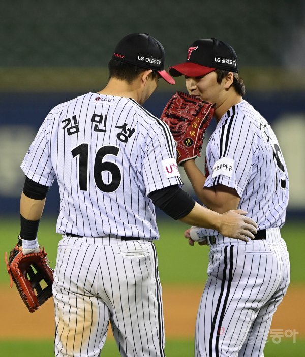 9회초 2사 1루 롯데의 땅볼 때 LG 고우석이 실책을 저지른 3루수와 이야기하고 있다.