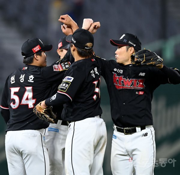 kt가 SSG에 6-1로 승리한 뒤 선수들이 그라운드에서 기쁨을 나누고 있다.