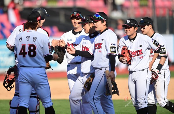 KT가 KIA에 9-2로 승리를 거둔 뒤 선수들이 주먹을 맞대며 기뻐하고 있다.