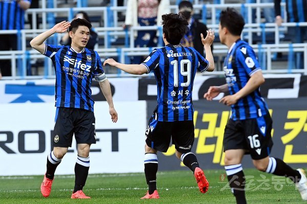 2일 인천 축구전용경기장에서 열린 ‘하나원큐 K리그1 2021’ 인천 유나이티드와 강원 FC의 경기에서 인천 김도혁이 골을 넣은 뒤 어시스트를 기록한 송시우와 기쁨을 나누고 있다.