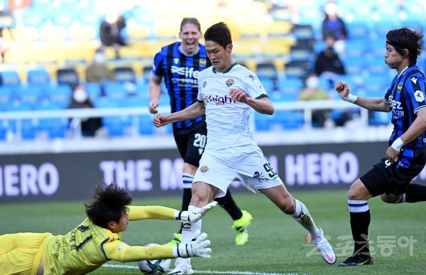 2일 인천 축구전용경기장에서 열린 ‘하나원큐 K리그1 2021’ 인천 유나이티드와 강원 FC의 경기에서 강원 박상혁의 슛이 인천 골키퍼에게 막히고 있다.