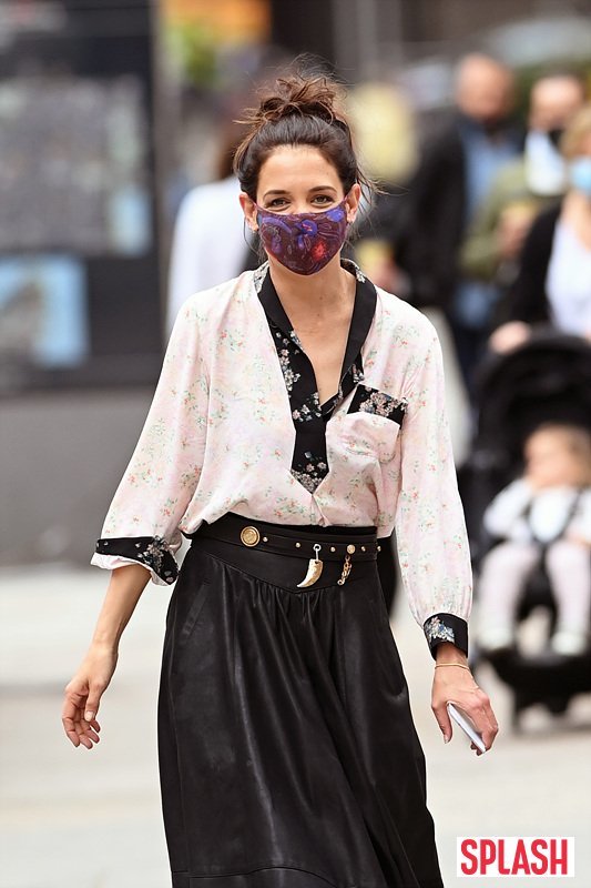 3일(현지시간) 미국 뉴욕에 한 영화 촬영장에서 포착된 케이티 홈즈는 플로럴 패턴의 연핑크 블라우스와 블랙 롱 스커트를 매치한 패션으로 단아한 분위기를 자아냈다.