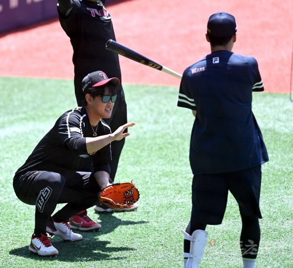 5일 서울 잠실야구장에서 ‘ 2021 신한은행 SOL KBO리그’ LG 트윈스와 두산 베어스 경기가 열린다. LG 정주현이 누군가와 인사를 하고 있다.