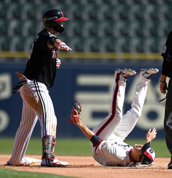 6회초 1사 LG 홍창기가 좌전 안타를 치고 2루까지 달려 세이프 되고 있다.