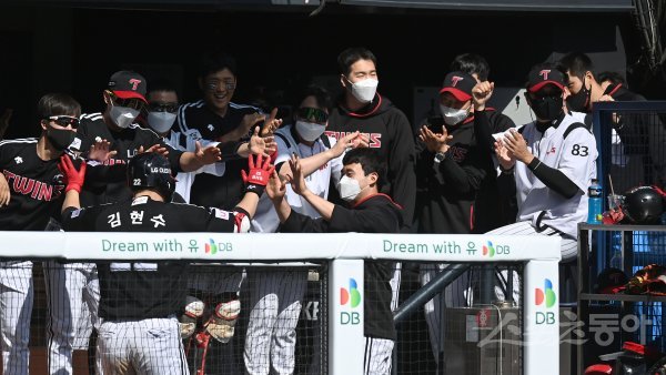 5회초 무사 1루 LG 김현수가 우월 투런 홈런을 날리고 그라운드를 돌아 홈인해 하이파이브 하고 있다.