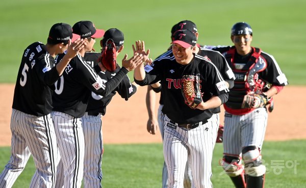 7-4 역전을 거둔 후 LG 김현수가 하이파이브 하고 있다.