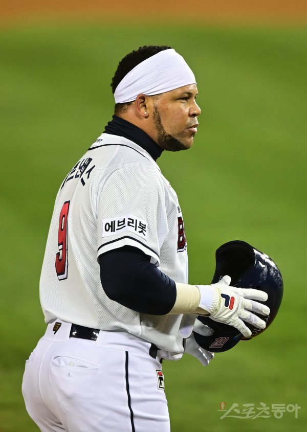 6회말 무사 2, 3루 상황에서 두산 3루주자 페르난데스가 헬멧을 벗어 땀을 식히고 있다.