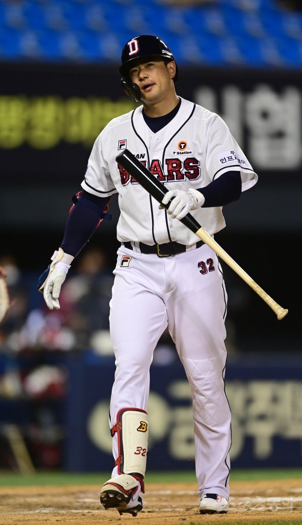 4회말 무사 1루 두산 김재환이 삼진 아웃을 당한 뒤 아쉬워하고 있다.