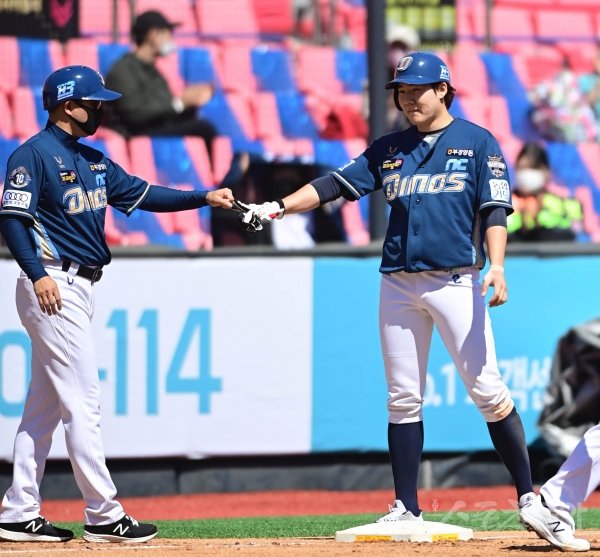 9일 수원KT위즈파크에서 ‘2021 신한은행 SOL KBO리그’ KT 위즈와 NC 다이노스의 더블헤더 1차전 경기가 열렸다. 2회초 1사 2루 상황에서 NC 2루주자 박민우가 3루 도루에 성공한 뒤 3루코치의 축하를 받고 있다.