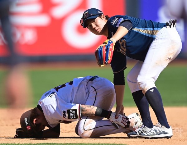 9일 수원KT위즈파크에서 ‘2021 신한은행 SOL KBO리그’ KT 위즈와 NC 다이노스의 더블헤더 1차전 경기가 열렸다. 5회말 1사 1루 KT의 내야 땅볼 때 1루주자 김민혁이 NC 박민우에게 태그 아웃된 후 발목에 통증을 호소하고 있다.