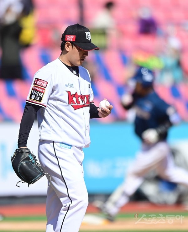 9일 수원KT위즈파크에서 ‘2021 신한은행 SOL KBO리그’ KT 위즈와 NC 다이노스의 더블헤더 1차전 경기가 열렸다. 4회초 1사 1, 2루 NC에게 우전 3점 홈런을 허용한 KT 하준호가 아쉬워하고 있다.