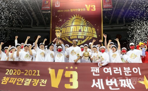 9일 경기도 안양체육관에서 열린 ‘2020-2021 현대모비스 프로농구’ 안양 KGC와 전주 KCC의 챔프전 4차전 경기에서 KGC가 KCC를 꺾고 우승을 차지한 뒤 선수들이 기념촬영을 하고 있다.