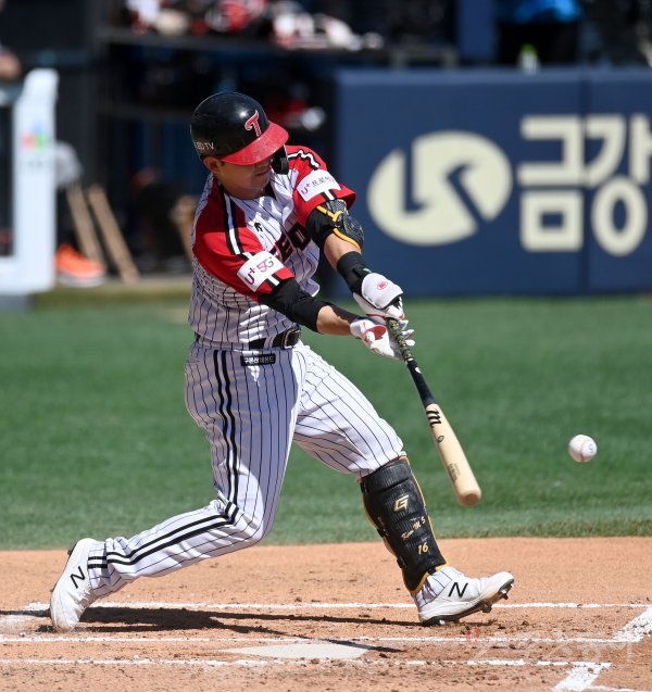 2회말 1사 1루 LG 김민성이 좌전 2루타를 치고 있다.