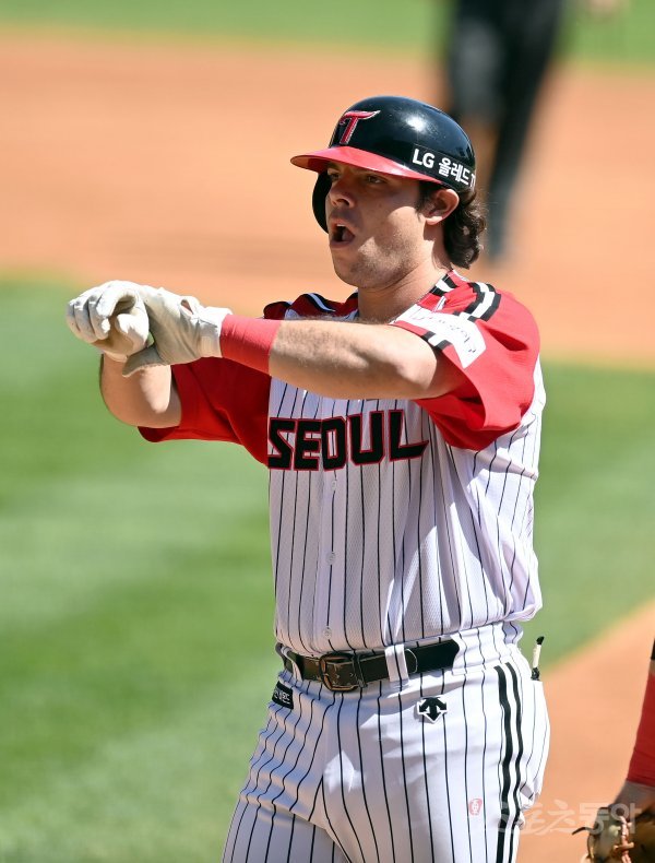 2회말 1사 LG 라모스가 중전 안타를 치고 1루에서 세리머니를 하고 있다.
