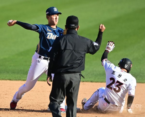 9회말 1사 1, 2루 KT의 내야 땅볼 때 NC 유격수 노진혁이 1루주자를 포스 아웃시킨 뒤 1루로 송구하고 있다.
