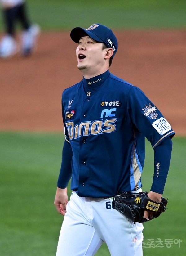 2회말 수비를 마친 뒤 NC 최금강이 만루 허용을 아쉬워하고 있다.