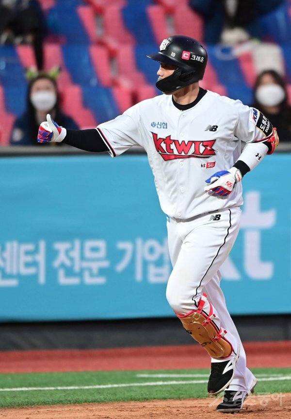 4회말 2사 3루 KT 박경수가 좌월 2점 홈런을 쳐낸 뒤 세리머니를 하고 있다.