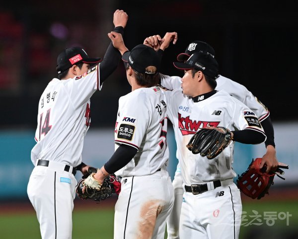 KT가 NC에 9-5로 승리를 거둔 뒤 선수들이 기쁨을 나누고 있다.