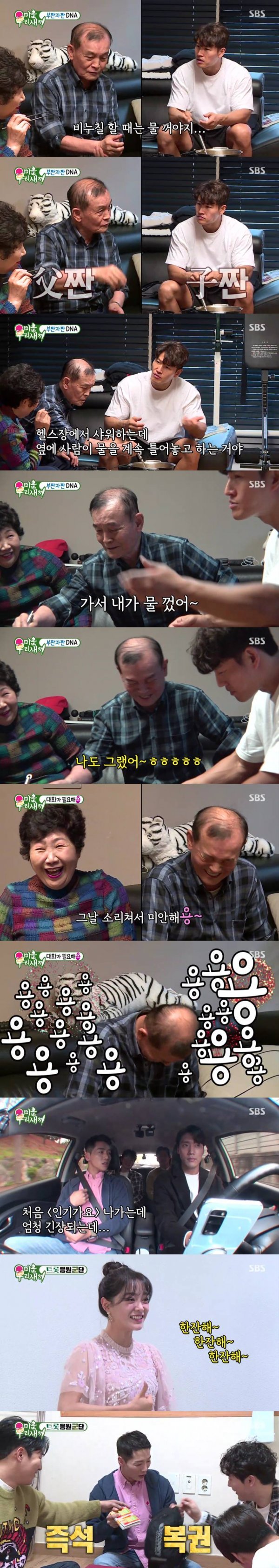 이어 종국은 부모님께 부부 싸움을 안하게 만드는 꿀팁으로 말끝에 ‘ㅇ’을 붙이는 걸 제안했다. 종국父는 쑥쓰럽고 민망해서 계속 망설였는데, 어머니와 아들의 성화에 못이겨 결국 “그날 소리쳐서 미안해용”이라고 말해 큰 웃음을 안겨주었다.