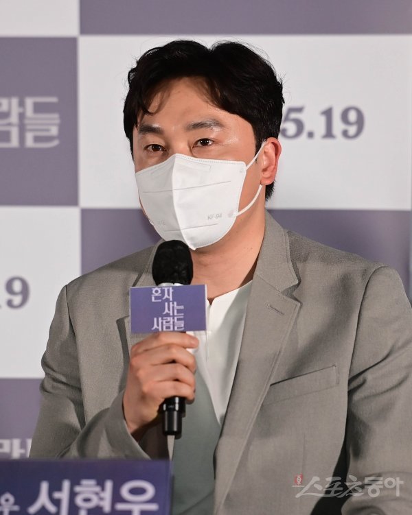 배우 서현우가 11일 서울 광진구 자양동 롯데시네마 건대입구점에서 열린 영화 ‘혼자 사는 사람들’ 언론시사회에서 인사말을 하고 있다.