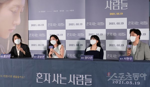 홍성은 감독, 배우 공승연, 정다은, 서현우(왼쪽부터)가 11일 서울 광진구 자양동 롯데시네마 건대입구점에서 열린 영화 ‘혼자 사는 사람들’ 언론시사회에서 질문에 답하며 웃고 있다.