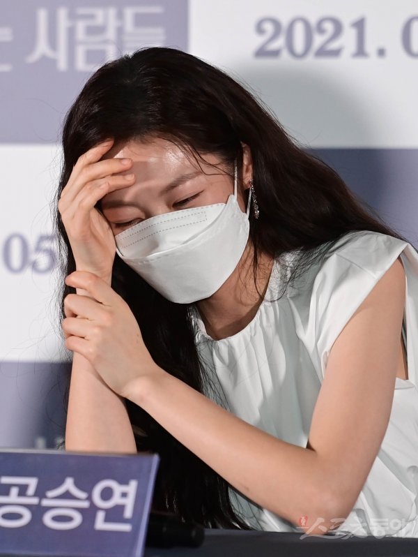 배우 공승연이 11일 서울 광진구 자양동 롯데시네마 건대입구점에서 열린 영화 ‘혼자 사는 사람들’ 언론시사회에서 진행자의 전주국제영화제 배우상 수상 축하에 얼굴을 가리고 있다.