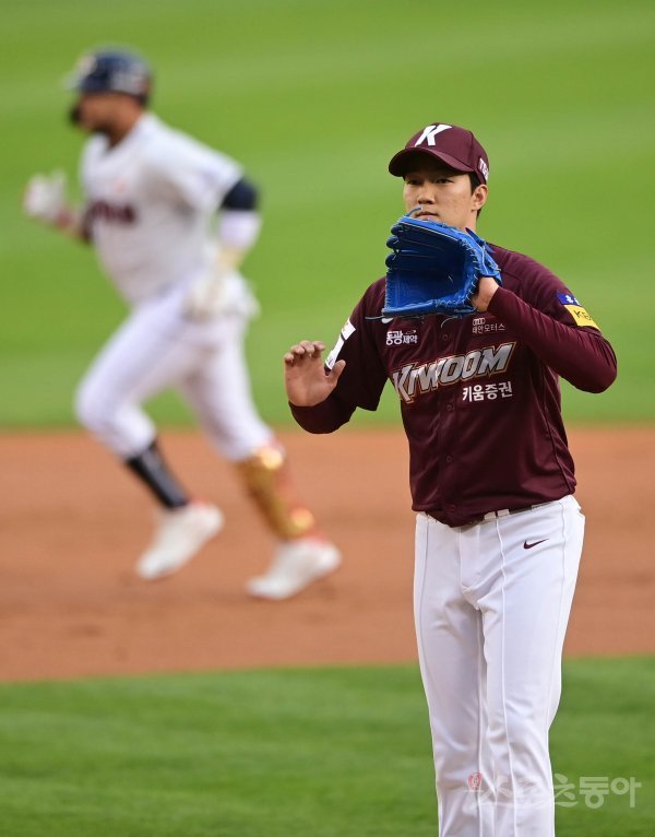 1회말 2사 두산에 솔로포를 허용한 키움 안우진이 굳은 표정으로 포수를 바라보고 있다.