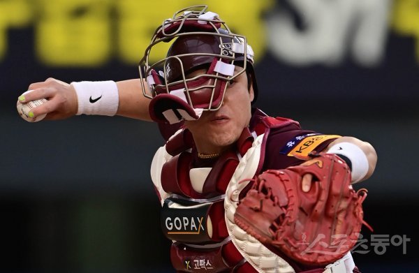 2회말 2사 1루 상황에서 키움 포수 박동원이 1루로 견제구를 던지고 있다.