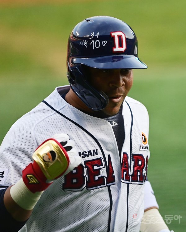 1회말 2사 두산 페르난데스가 선제 우월 솔로 홈런을 쳐낸 뒤 그라운드를 돌고 있다.