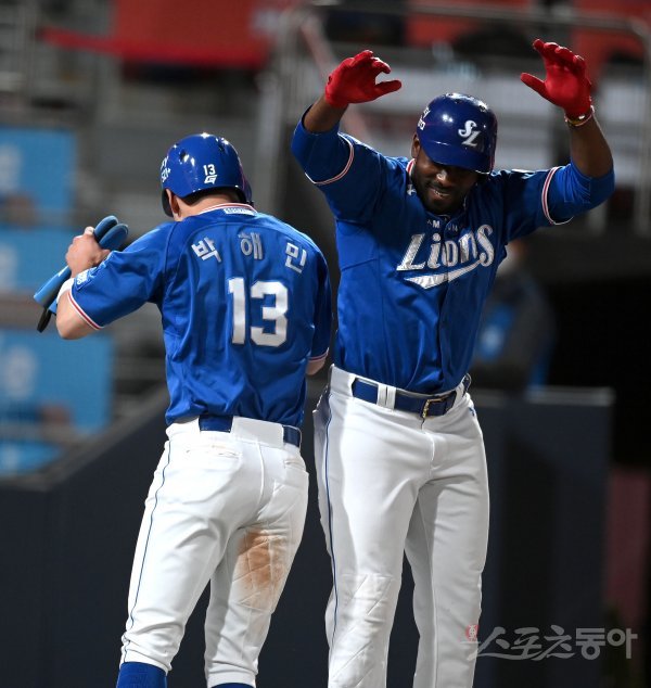 4회초 2사 3루루 삼성 피렐라가 역전 우월 투런 홈런을 날리고 그라운드를 돌아 홈인해 하이파이브 하고 있다.