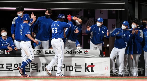 4회초 2사 3루루 삼성 피렐라가 역전 투런 솔로 홈런을 날리고 그라운드를 돌아 홈인해 하이파이브 하고 있다.