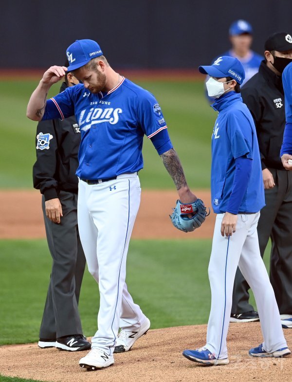 선발 투수로 등판한 삼성 라이블리 경기 시작 전 우측 어깨 통증으로 교체되고 있다.