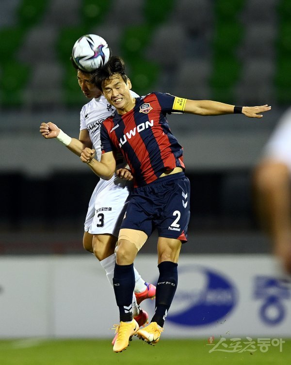 11일 경기도 수원종합운동장에서 열린 ‘하나원큐 K리그1 2021’ 수원FC와 광주FC의 경기에서 광주 이민기와 수원 정동호가 공중볼을 다투고 있다.