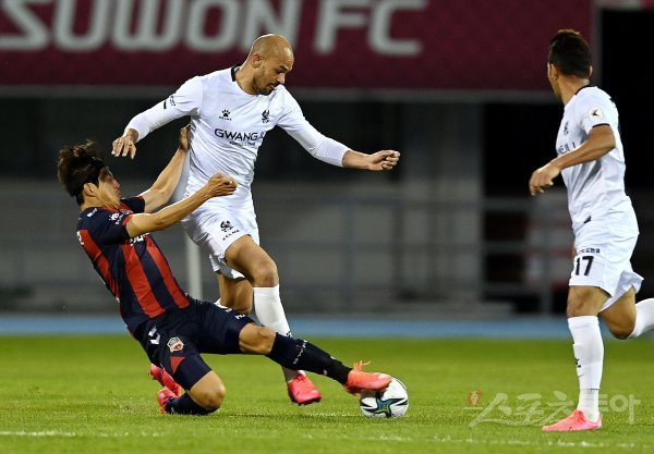 11일 경기도 수원종합운동장에서 열린 ‘하나원큐 K리그1 2021’ 수원FC와 광주FC의 경기에서 광주 펠리페가 돌파할 때 수원 수비에 막히고 있다.