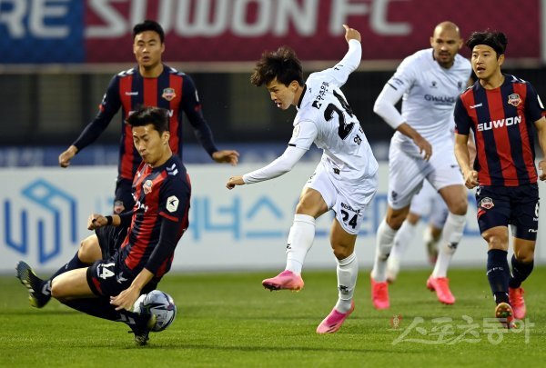 11일 경기도 수원종합운동장에서 열린 ‘하나원큐 K리그1 2021’ 수원FC와 광주FC의 경기에서 광주 엄지성이 슛을 쏘고 있다.