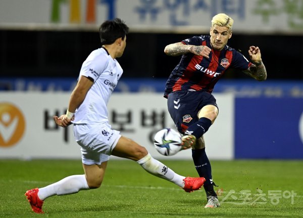 11일 경기도 수원종합운동장에서 열린 ‘하나원큐 K리그1 2021’ 수원FC와 광주FC의 경기에서 수원 라스가 역전골을 넣고 있다.
