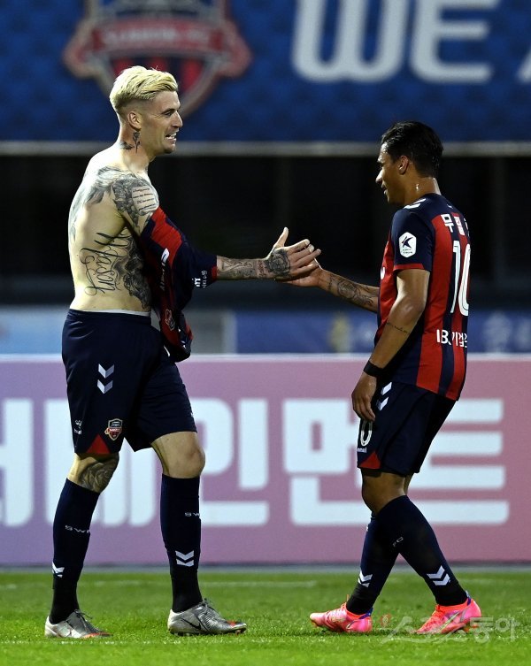 11일 경기도 수원종합운동장에서 열린 ‘하나원큐 K리그1 2021’ 수원FC와 광주FC의 경기에서 수원 라스가 역전골을 넣은 뒤 동점골 무릴로와 기쁨을 나누고 있다.
