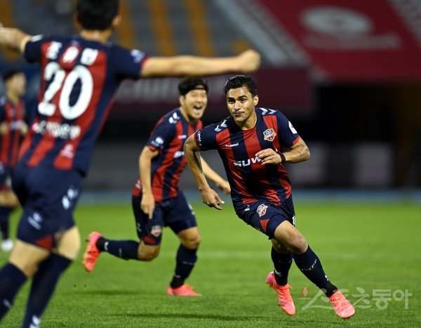 11일 경기도 수원종합운동장에서 열린 ‘하나원큐 K리그1 2021’ 수원FC와 광주FC의 경기에서 수원 무릴로가 동점골을 넣은 뒤 환호하고 있다.