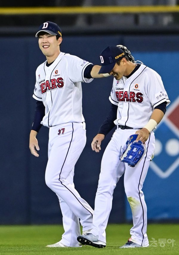 9회초 2사 1루 키움의 우익수 뜬공 때 두산 박건우가 타구를 잡은 안권수를 칭찬하고 있다.