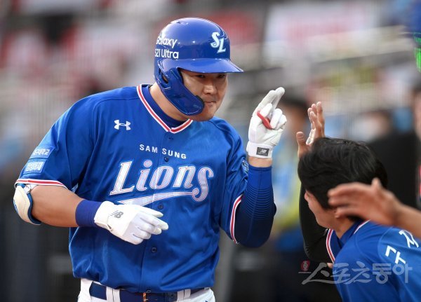 3회초 2사 삼성 오재일이 우월 솔로 홈런을 날리고 그라운드를 돌아 홈인해 하이파이브 하고 있다.