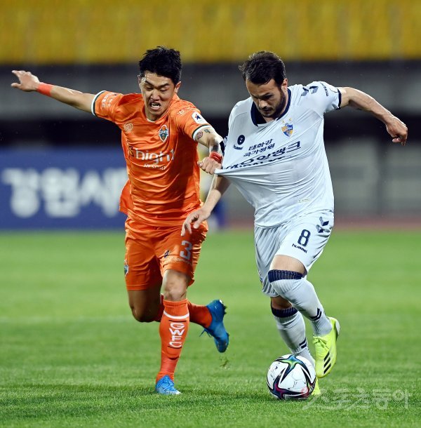 12일 강원도 춘천 송암스포츠타운에서 열린 ‘하나원큐 K리그1 2021’ 강원FC와 울산 현대의 경기에서 울산 바코가 강원 신세계의 수비를 제치며 돌파하고 있다.