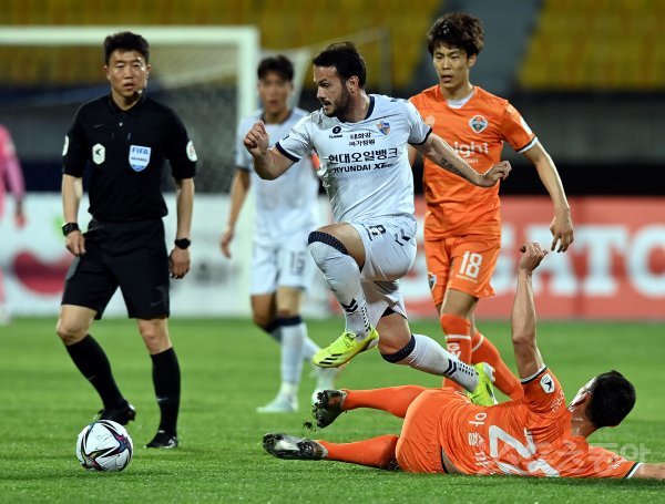 12일 강원도 춘천 송암스포츠타운에서 열린 ‘하나원큐 K리그1 2021’ 강원FC와 울산 현대의 경기에서 울산 바코가 강원 수비수의 태클을 피해 돌파하고 있다.