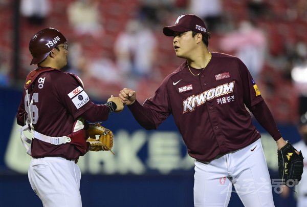 키움이 두산에 3-0으로 승리를 거둔 뒤 조상우와 이지영이 주먹을 맞대고 있다.