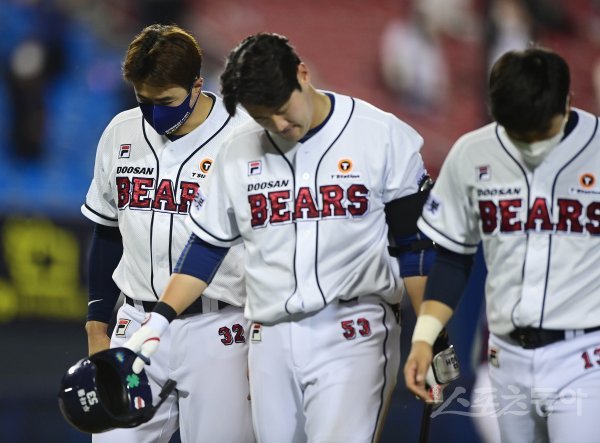 두산이 키움에 0-3으로 패한 뒤 김재환과 양석환이 고개 숙인 채 더그아웃으로 들어가고 있다.