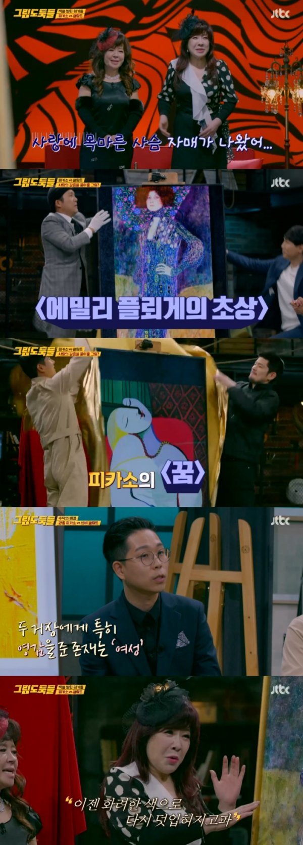 어제(12일) 첫 방송된 JTBC 신규 프로그램 ‘그림도둑들’(연출 김미연, 박범준)에서는 도둑들로 변신한 MC들의 꿀잼 호흡과 함께 색을 밝힌 두 거장 피카소와 클림트의 작품에 숨겨진 흥미진진한 비화를 전해 재미와 지식, 두 마리 토끼를 모두 잡았다.