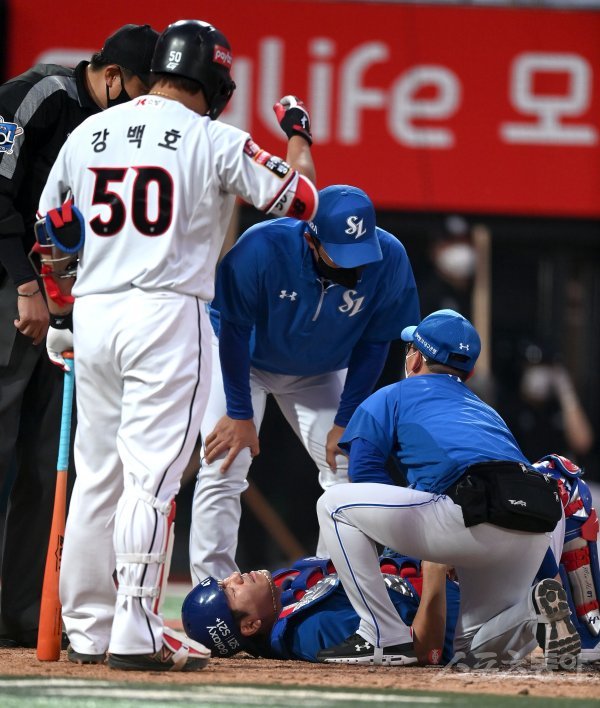 3회말 2사 삼성 포수 강민호가 파울 타구에 맞고 고통스러워 하고 있다.