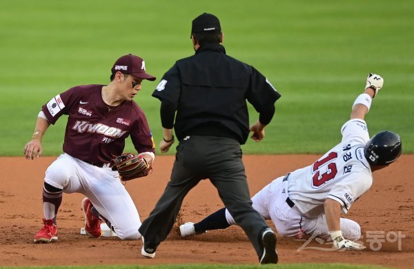1회말 2사 1루 상황에서 키움 2루수 서건창이 두산 1루주자를 태그 아웃시키고 있다.