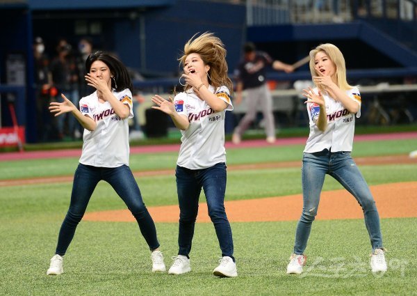 16일 서울 고척스카이돔에서 ‘2021 신한은행 SOL KBO리그’ 한화 이글스와 키움 히어로즈 경기가 열렸다. 경기 전 걸그룹 써드아이가 공연을 펼치고 있다.