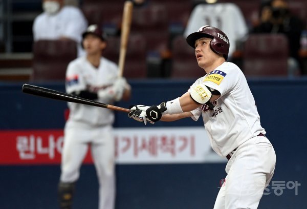 16일 서울 고척스카이돔에서 ‘2021 신한은행 SOL KBO리그’ 한화 이글스와 키움 히어로즈 경기가 열렸다. 5회말 1사 키움 박동원이 선제 좌월 솔로 홈런을 날리고 있다. 고척 | 김종원 기자 won@donga.com