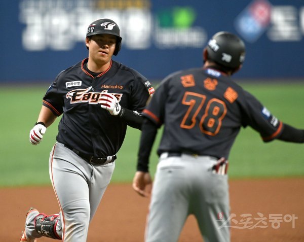 16일 서울 고척스카이돔에서 ‘2021 신한은행 SOL KBO리그’ 한화 이글스와 키움 히어로즈 경기가 열렸다. 9회초 1사 한화 노시환이 중월 솔로 홈런을 날린 후 그라운드를 돌고 있다.
